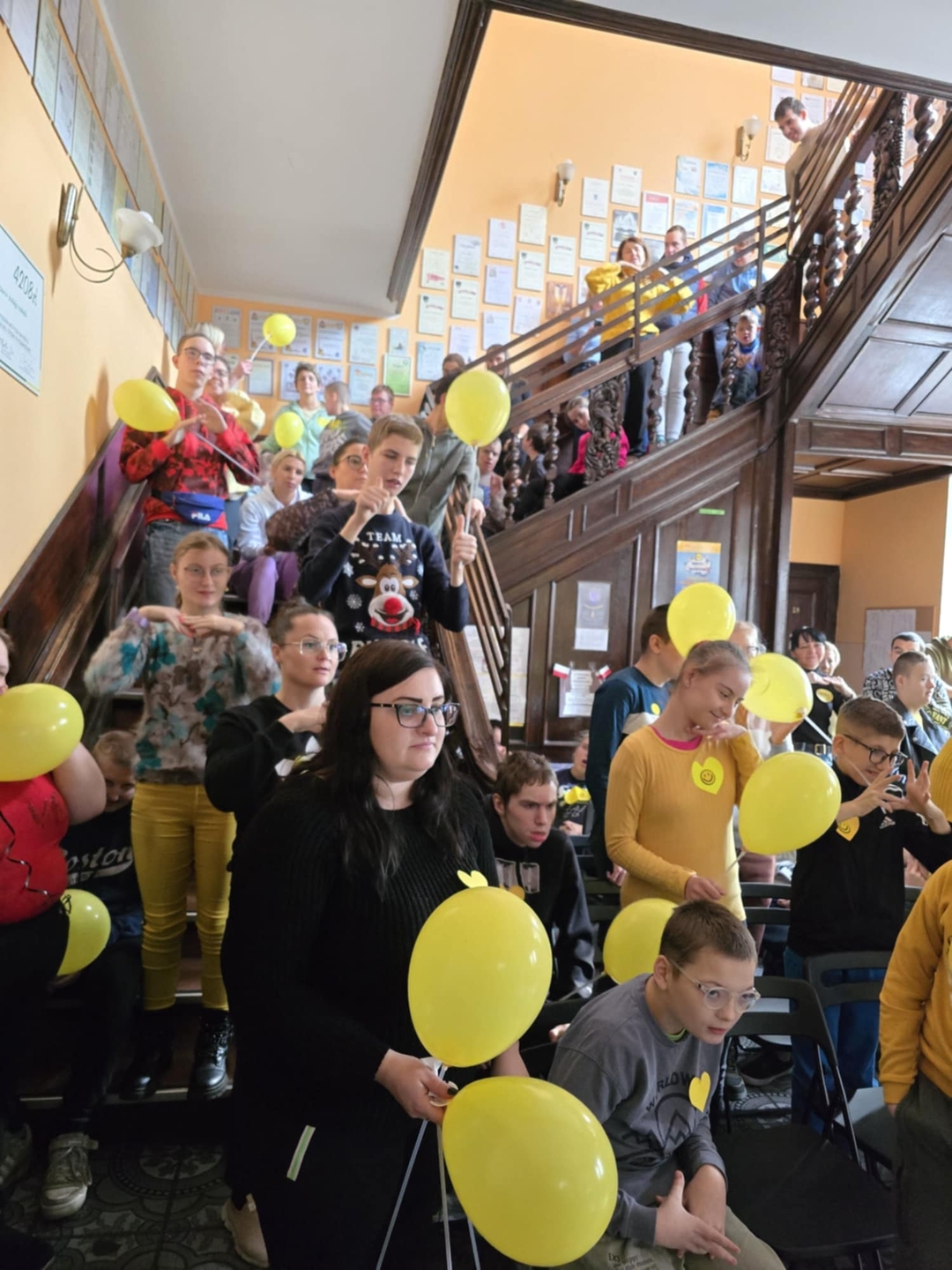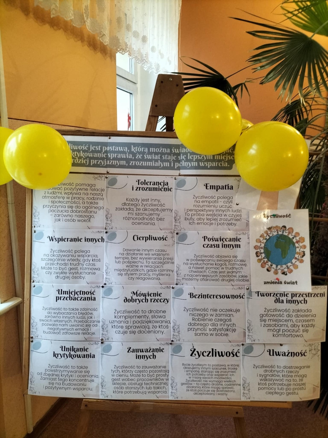 Świętowanie tegorocznego „Dnia Życzliwości” rozpoczęliśmy od samego rana. Uczniowie i nauczyciele przyszli do szkoły ubrani w kolorze żółtym- symbol radości i optymizmu. Hol szkoły zamienił się w „Aleje Życzliwości” wypełnioną licznymi cytatami i myślami na temat serdeczności, przyjaźni i życzliwości.